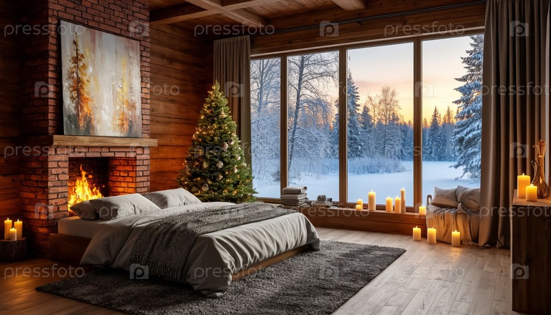 Уютная скандинавская спальня с камином, рождественской елкой и панорамным окном