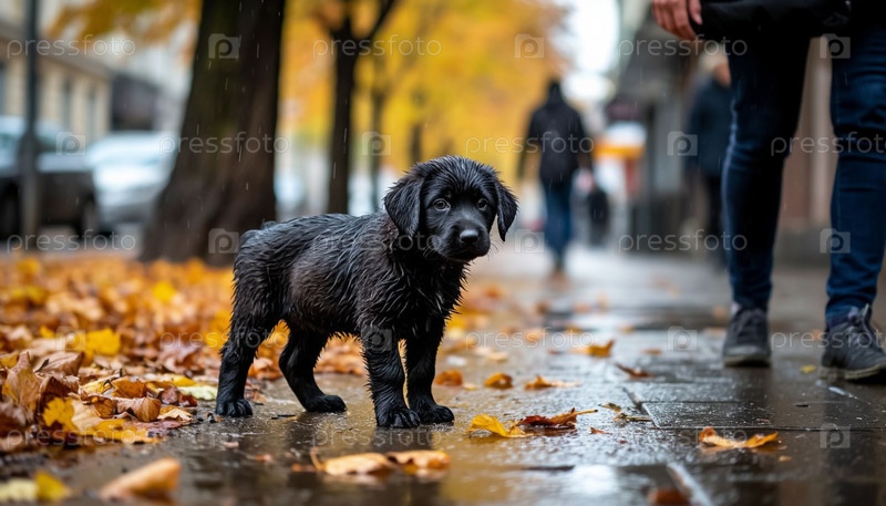 Бездомный щенк в городе под дождем, генерирующий ИИ