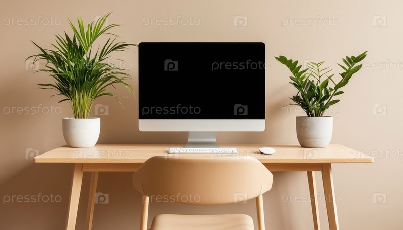 Монитор на деревянном столе против бежевой стены