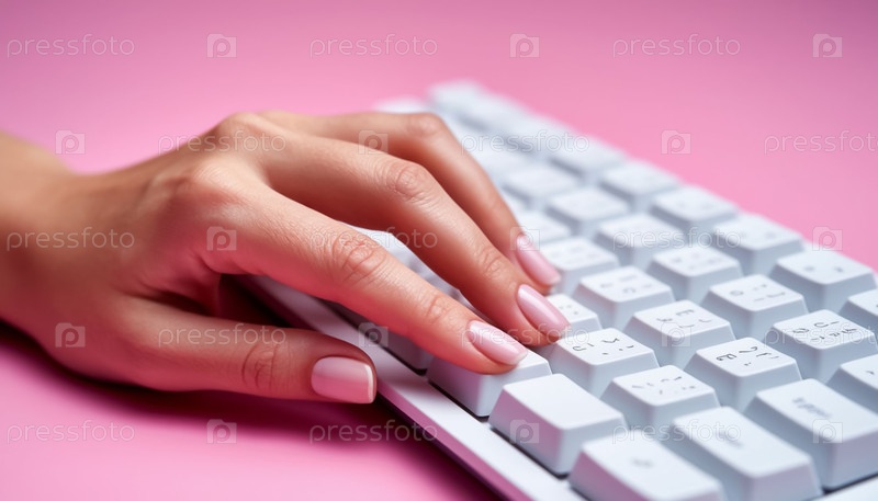 Женские руки с французским маникюром на белой клавиатуре
