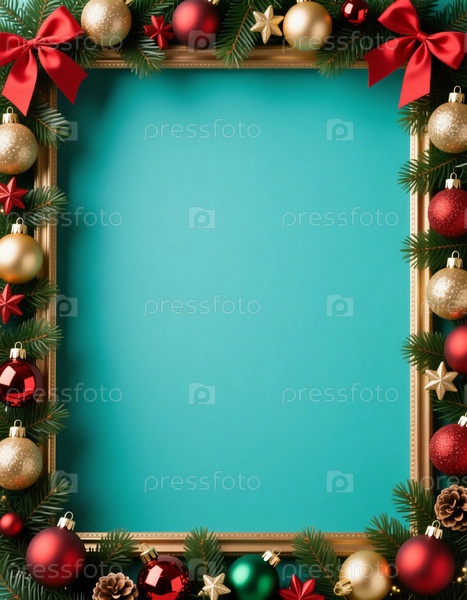 Красочные декорации представляют собой яркую раму, наполненную красными и золотыми украшениями в окружении пышной зелени, предназначенные для рождественских и новогодних праздников генеративного ИИ