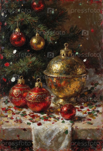 Ярко окрашенные украшения в красный и золотой цвета установлены вокруг золотого контейнера на столе, украшенном конфетти рядом с рождественской елкой, заполненной орнаментами генеративного ИИ