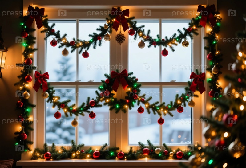 Красиво украшенное окно с гирляндой, украшенной шариками на рождественской елке и красочными огнями создает теплую атмосферу, привнося праздничное ощущение в эту зимнюю сцену генеративного ИИ