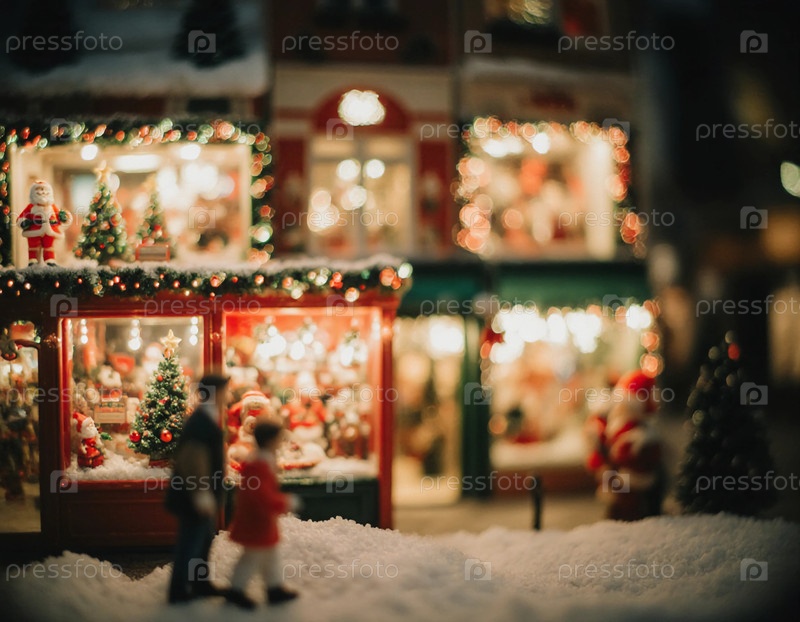 Люди прогуливаются по заснеженной городской площади, восхищаясь праздничными украшениями, мерцающими огнями и праздничными витринами
