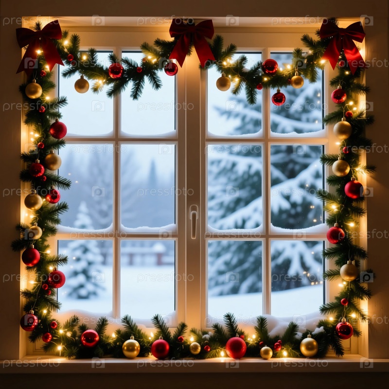Красиво украшенное окно демонстрирует рождественские декорации и венки, а снег окутывает пейзаж снаружи, создавая теплую праздничную сцену