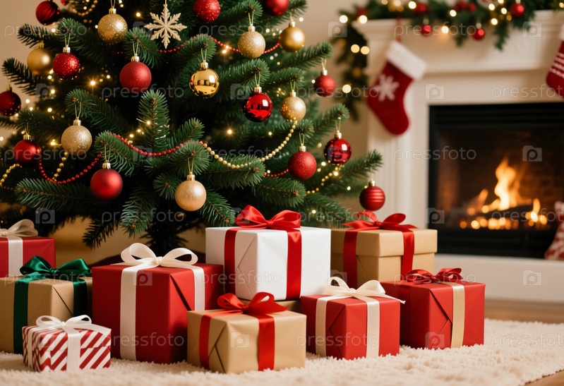 Под красиво украшенной рождественской елкой на мягком ковре сидят подарочные ящики разных цветов. трескающий огонь в камине добавляет тепла к праздничной атмосфере генеративного ИИ