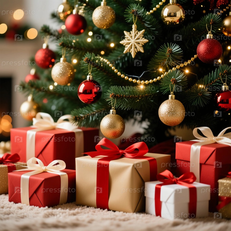 Красочные коробки с подарками размещаются под блестящей рождественской елкой, украшенной яркими декорациями и мерцающими огнями, создавая праздничную атмосферу для новогоднего сезона генеративного ИИ