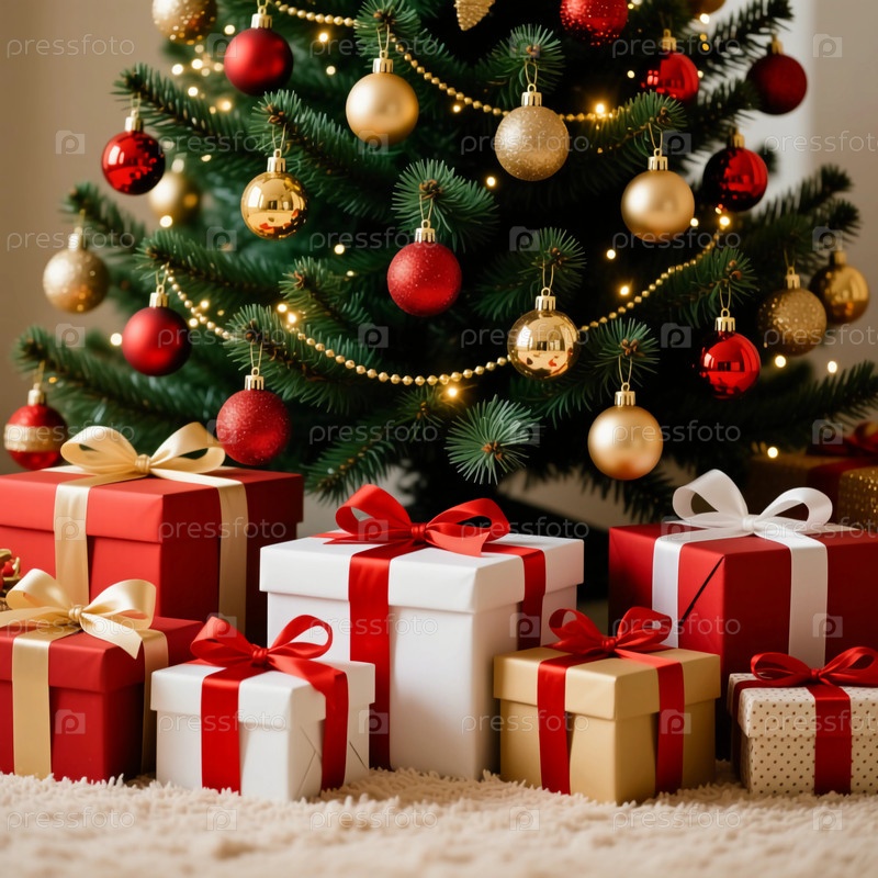 Красочные коробки для подарков, упакованные в красный, белый и золотой цвета, сидят под украшенной рождественской елкой в уютной гостиной Generative AI