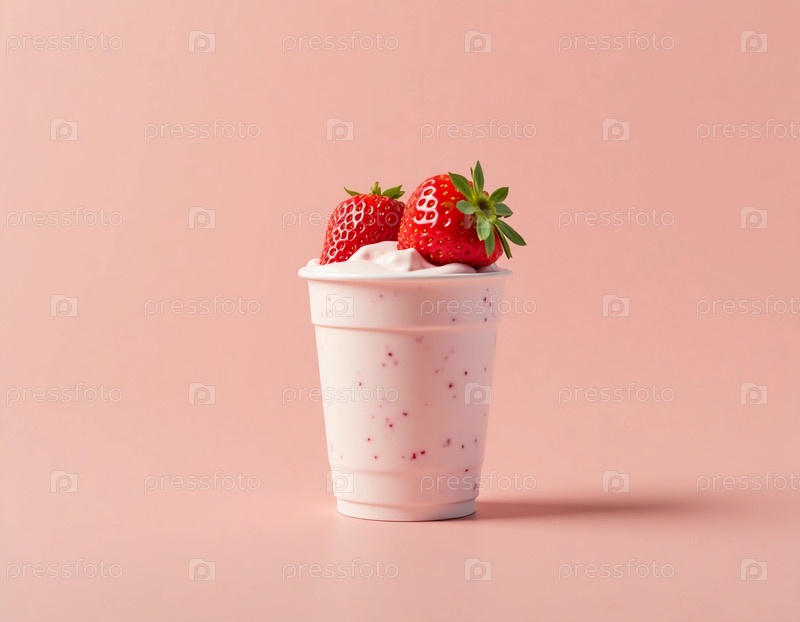 Чашка, заполненная сливочным клубниковым йогуртом, демонстрирует две яркие ягоды на верхнем наборе на мягком розовом фоне, приглашая попробовать свежесть и удовольствие генеративного ИИ