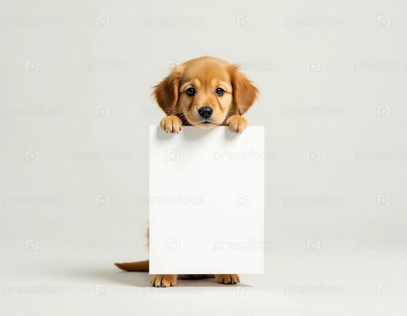 Игровое щенко с мягким золотистым мехом внимательно сидит, держа пустую доску плакатов в лапах, приглашая творчество и веселье в простой, хорошо освещённой студии генеративного искусственного интеллекта