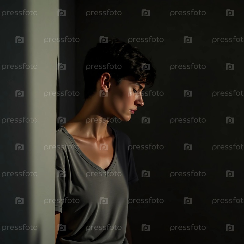 Женщина стоит одна на стене, тени окутывают ее, когда она размышляет о своих чувствах депрессии.Мягкий свет подчеркивает её интроспективное выражение генеративного ИИ