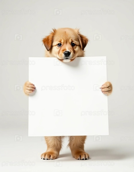Игровое щенко стоит прямо, с гордостью держит большой чистый плакат во рту