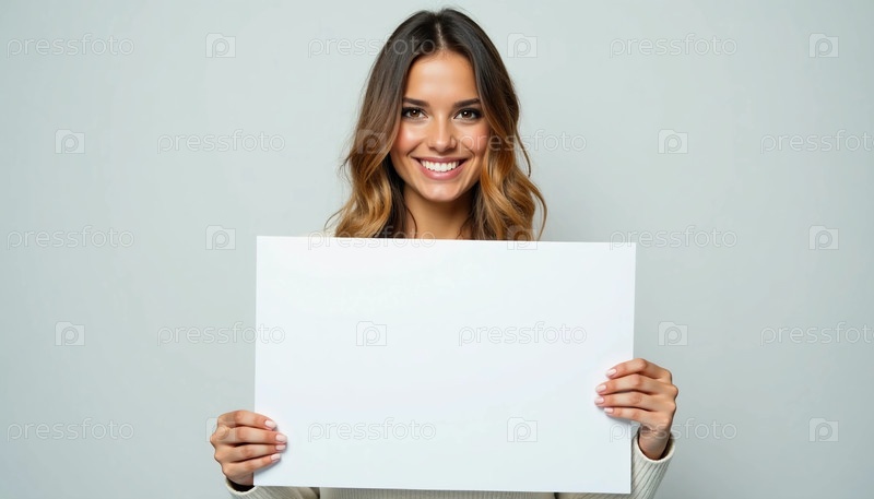 Улыбающаяся женщина держит чистый плакат, излучающий уверенность и позитивность.Минималистская студия имеет мягкое освещение, улучшающее ее выражение и чистый фон генеративного ИИ