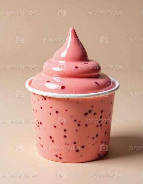 Гладкий, кремовый клубничный йогурт крутится высоко в яркой чашке, украшенной крошечными фруктовыми кусочками, принося сладкий и освежающий момент, идеально подходящий для солнечного дня