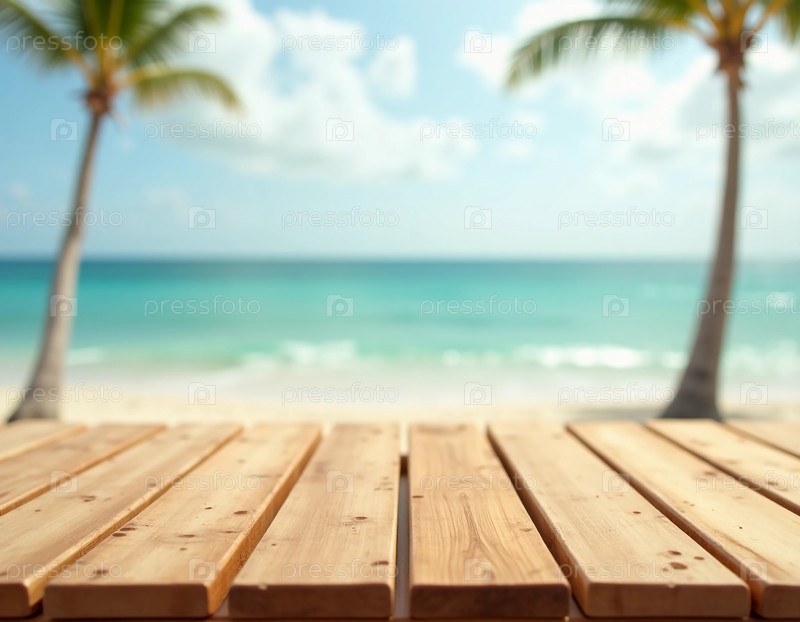 Наслаждайтесь солнечным днем на пляже с красиво выполненным деревянным столом в переднем плане
