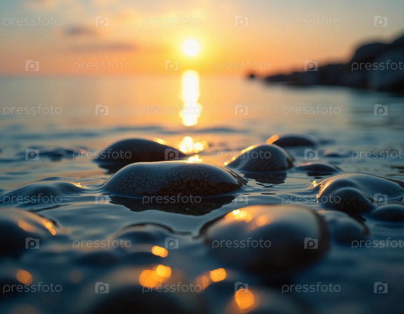 Когда солнце восходит на горизонте, золотой свет танцует над нежными волнами, освещая гладкие камни на берегу воды, создавая спокойную атмосферу