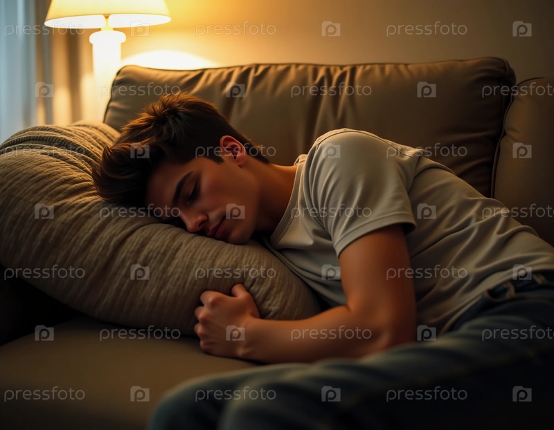 Молодой человек наслаждается спокойным моментом, тихо спит на удобном диване в мягко освещенной гостиной.Теплый свет лампы создает безмятежную атмосферу Generative AI