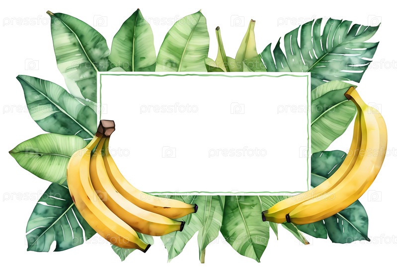 Странное искусство банановых фруктов в ярких акварелях, окруженные пышными зелеными листьями, идеально подходит для творческой поздравительной открытки или плаката с достаточным количеством пустого места для настройки генеративного ИИ