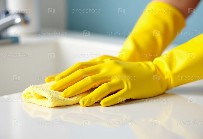Руки, украшенные желтыми резиновыми перчатками, стирают кухонный столик мягкой тканью, обеспечивая чистоту в яркой и дружественной среде, проявляя внимание к деталям