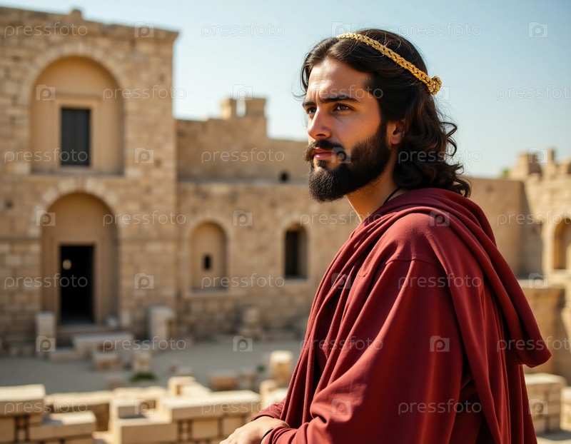 Будьте свидетелями мгновения размышления в Иерусалиме, где Христос Иисус стоит среди древних каменных сооружений, олицетворяющих богатое духовное наследие на фоне чистого синего неба