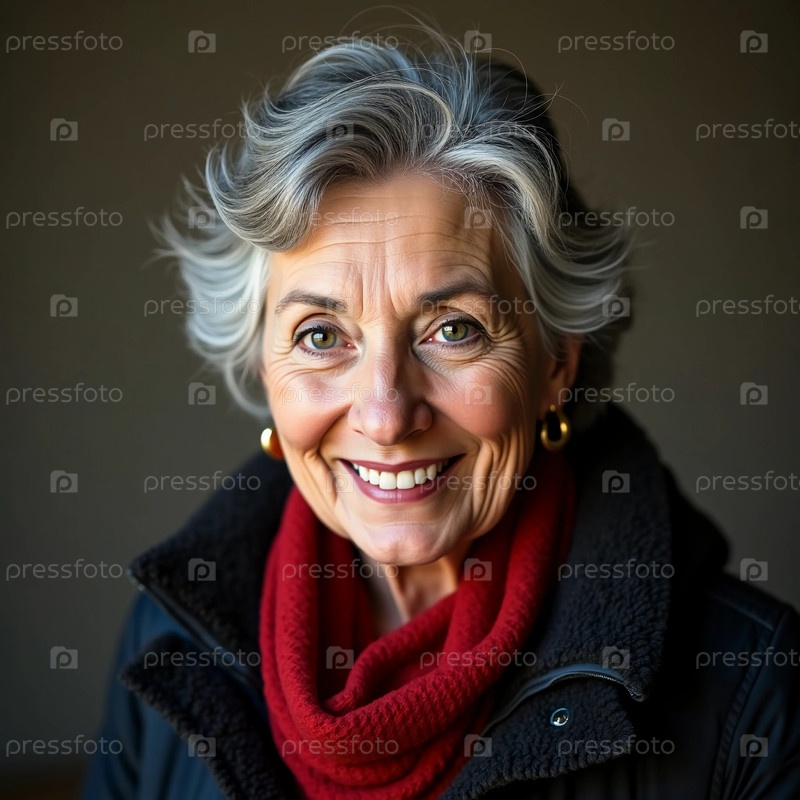 Счастливая старая женщина со серебристыми волосами излучает тепло и счастье, нося уютный свитер.Её яркая улыбка освещает внутреннюю атмосферу в окружении любви и воспоминаний