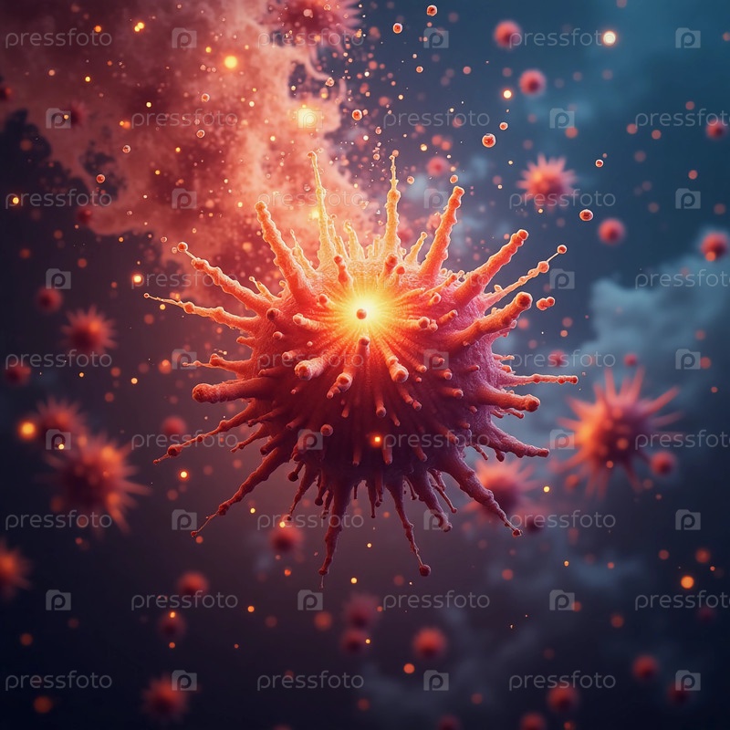 Красочное изображение захватывает сложный дизайн вирусной клетки на космическом фоне, демонстрируя шипы и светящиеся эффекты в потрясающей атмосфере