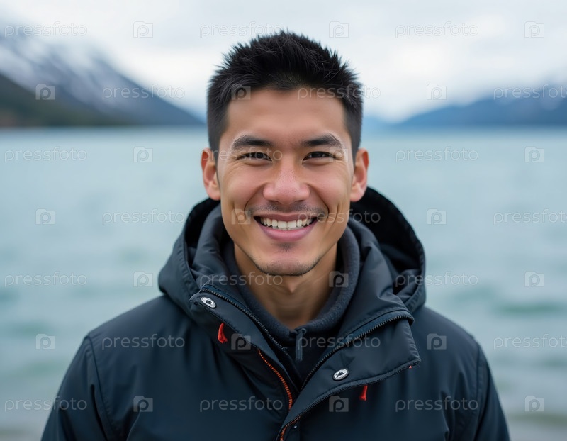 Старший коренной житель Аляски тепло улыбается спокойному фьорду, с величественными горами позади него, отражающим его богатое культурное наследие