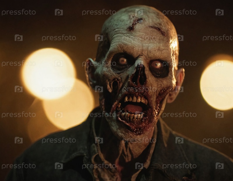 Ужасный зомби-человек открывает глаза во тьму, показывая разложившиеся черты и окровавленную кожу в окружении преследующего слабо освещенного фона, который усиливает ужасы генеративного ИИ