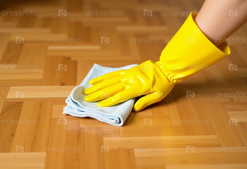 Рука в ярко-желтых резиновых перчатках усердно стирает сверкающий паркетный пол мягкой тканью, обеспечивая чистоту и блеск генеративного ИИ