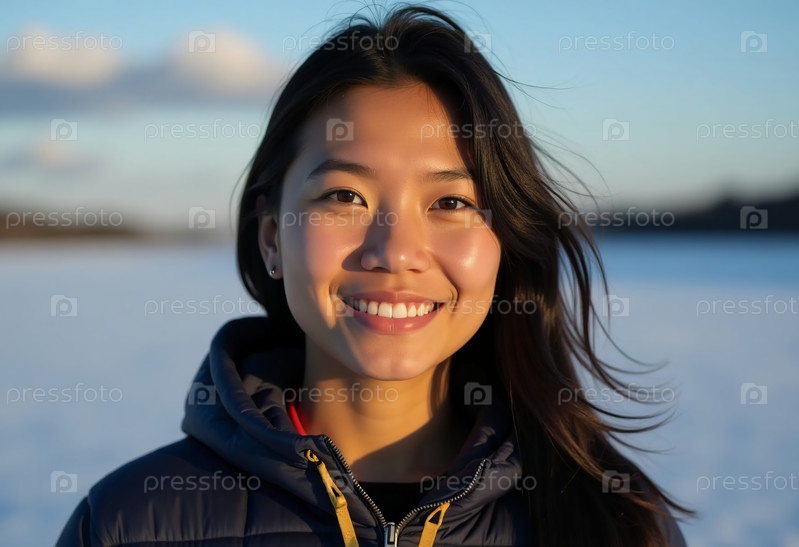 Пожилой абориген Аляски гордо стоит на холодном зимнем воздухе, ее теплая улыбка излучает дух и устойчивость среди мерцающего снега и неба