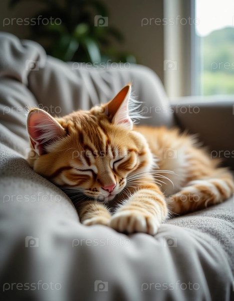 Красный пушистый кот спокойно спит на мягком диване, его шерсть светит в нежном дневном свете, стекающем через окно