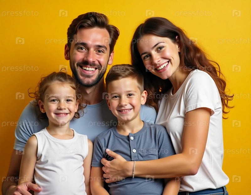 Эта любящая семья обнимает друг друга в момент радости, широко улыбаясь, когда они стоят вместе перед ярко-желтым фоном, излучая счастье и связь