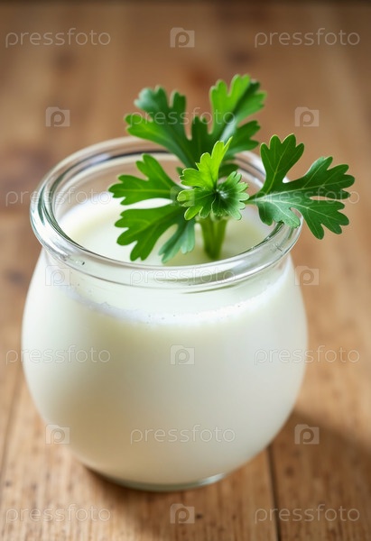 Свежие листья петрушки изысканно отдыхают в очаровательной стеклянной банке, наполненной кремовой добротой, приглашая кулинарное вдохновение и творчество на кухню генеративного ИИ