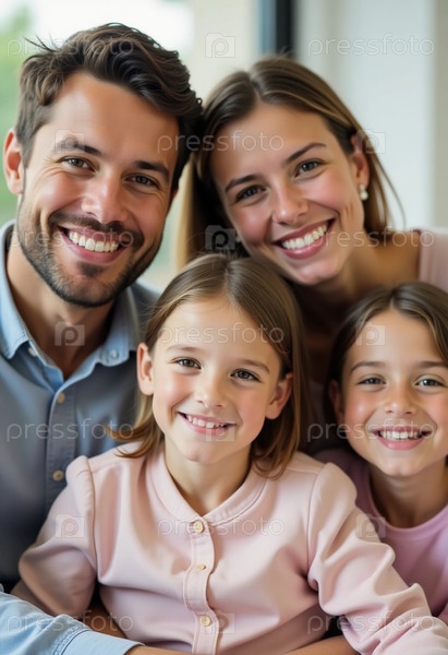 Счастливая семья собирается в помещении, делится улыбками и смехом.Родители сидят рядом со своими двумя дочерьми, захватывают момент тепла и единства в своем ярком, приглашающем к дому генеративном ИИ
