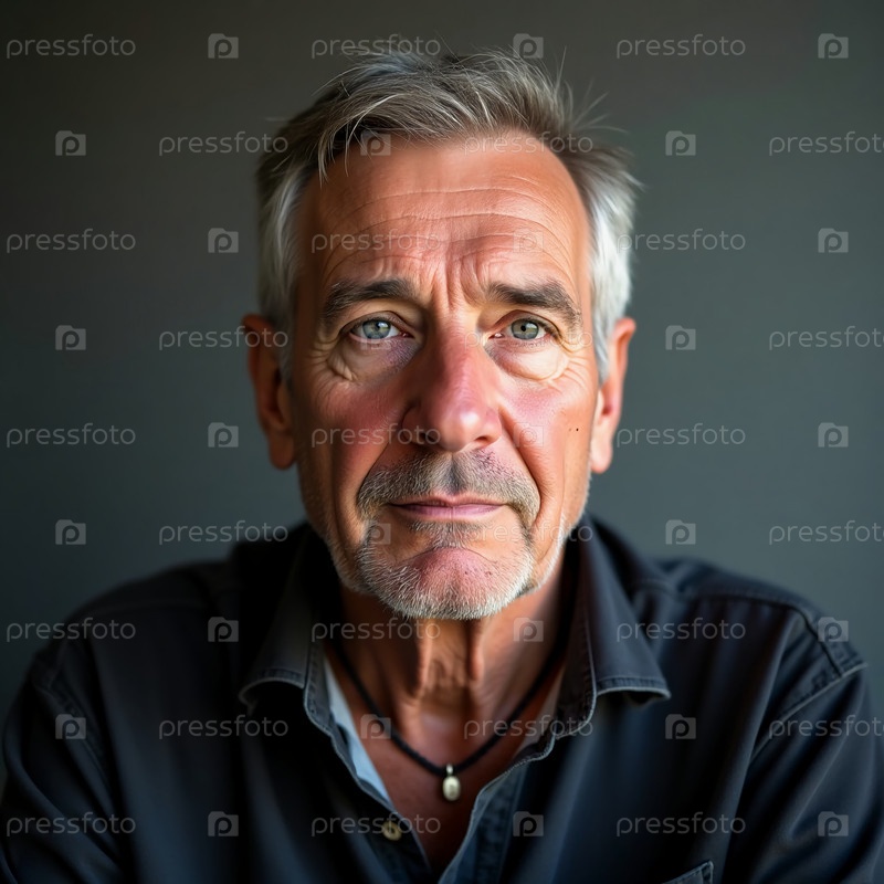 Пожилой человек внимательно смотрит с мудрыми глазами, его лицо отражает многолетний опыт и созерцание на фоне слабо освещенного фона