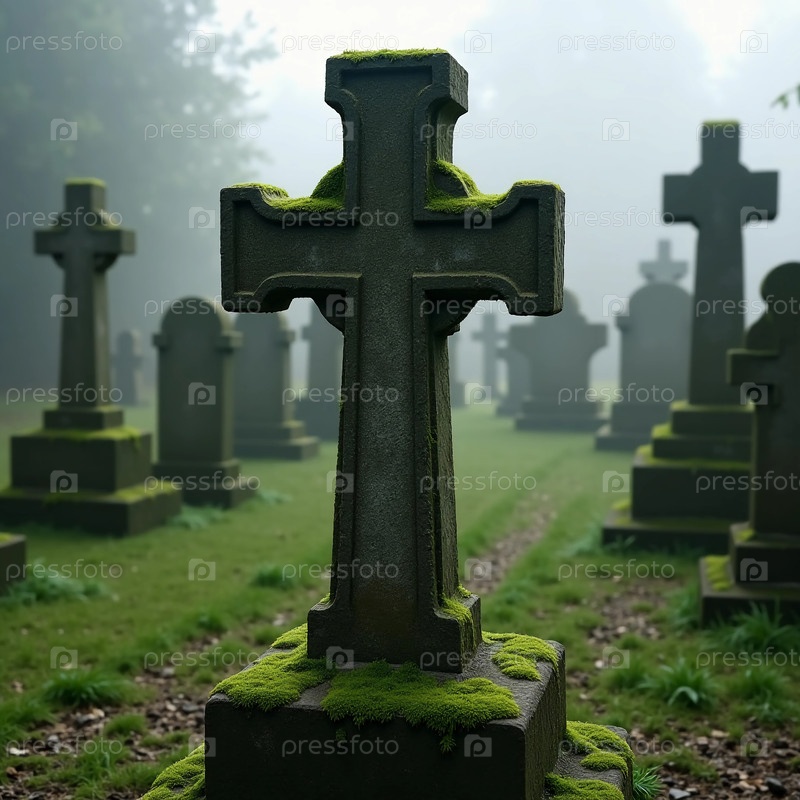 На заброшенном кладбище, окутанном туманом, мох покрывает древние каменные кресты и мемориалы. спокойная атмосфера вызывает навязчивую красоту, когда природа обнимает забытые гробницы
