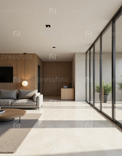 Солнечный свет наполняет стильное жилое пространство уютным диваном, гладким кофейным столом и горшковыми растениями, которые улучшают спокойную атмосферу генеративного AI