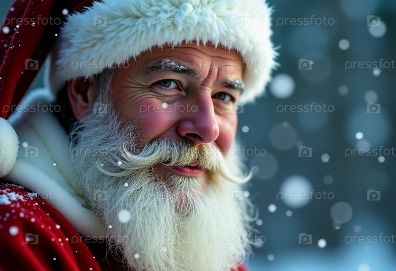 Веселый Санта-Клаус надевает классическую красную шляпу, его нежная улыбка освещается мягкими снежинками, падающими вокруг него, олицетворяя дух празднования Рождества и Нового года генеративным ИИ