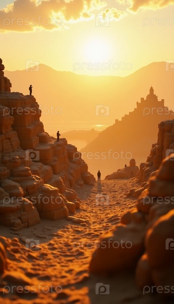 Золотые лучи освещают неровную местность, когда путешественники пересекают скалистые тропы.Древние холмы шепчут истории о еврейском наследии на фоне захватывающего заката солнца