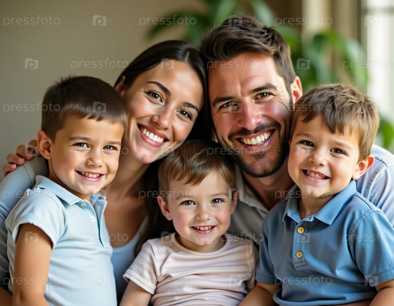 В теплой и привлекательной гостиной собирается счастливая семья, демонстрирующая свою любовь и связь через яркие улыбки и игривые позы