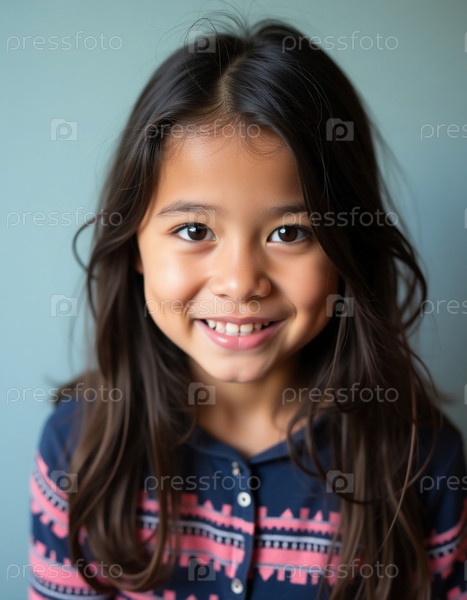 Очаровательная молодая девушка с длинными темными волосами тепло улыбается, олицетворяя свое родное наследие на Аляске.Его яркий костюм отражает богатую культуру и традиции ее общины
