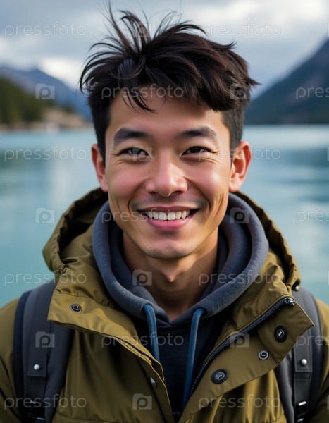 Пожилой человек стоит у спокойных вод Аляски, показывая радостную улыбку генеративного ИИ