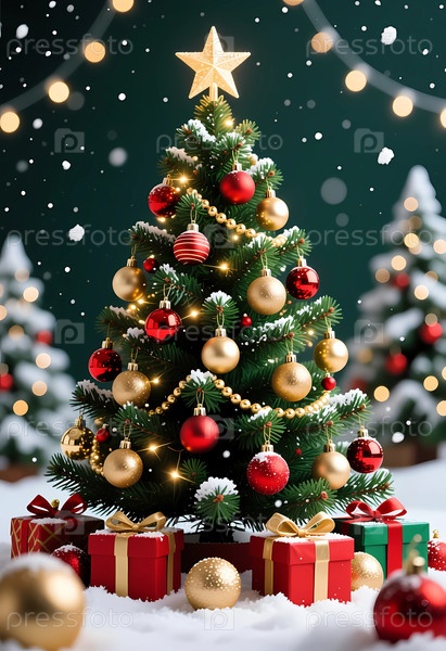 Красиво украшенная рождественская елка стоит высоко, сверкающая золотыми и красными ювелирными изделиями.Окруженная яркими подарками, эта праздничная обстановка отражает дух новогодних каникул и новогоднего поколения искусственного интеллекта