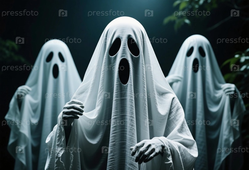 Три призрачные фигуры в белых простынях стоят в темном лесу, окруженном туманом и создают пугающую сцену.Это отражает жуткую сущность генеративного Хэллоуина AI