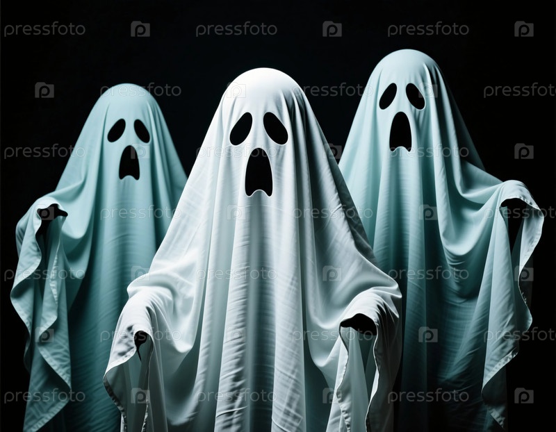Три призрака, изготовленные из простых белых листов с вырезанными глазами и ртом, стоят вместе, добавляя жуткую атмосферу к темной обстановке в ночь Хэллоуина