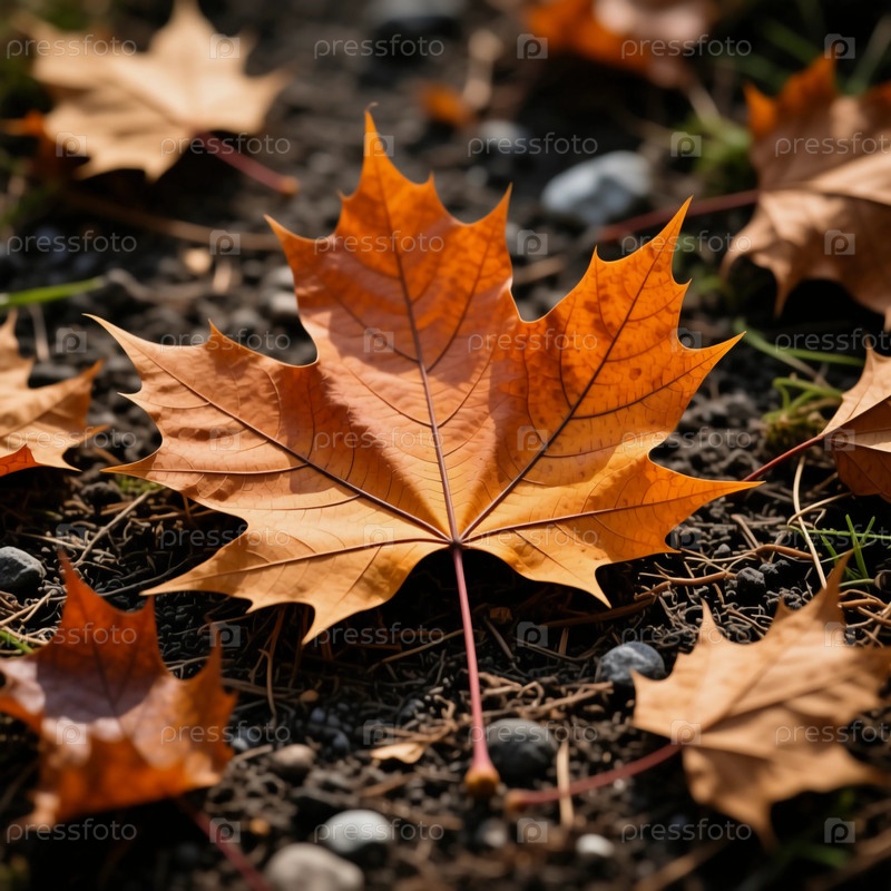 Красочные кленовые листья лежат на земле, показывая оттенки оранжевого и коричневого.Сцена захватывает сущность осени в спокойной парковой среде генеративного ИИ