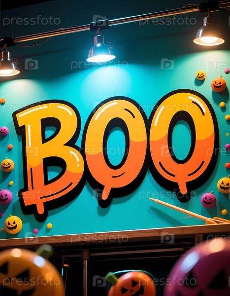 На стене освещается яркий знак с надписью 'Бу' жирными буквами.В красочной обстановке представлены игривые декорации, создающие веселую атмосферу Хэллоуина для гостей генеративного ИИ