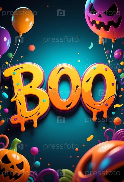 Яркая и смешная сцена Хэллоуина с яркими цветами слова Boo в окружении игривых шариков и жутких тыквен, создавая веселую атмосферу генеративного ИИ
