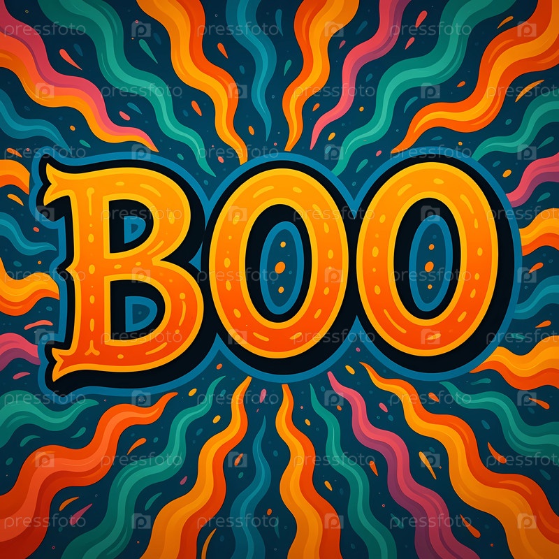 Цветный дизайн Хэллоуина содержит слово 'boo' яркими буквами.На фоне представлены волнистые узоры в оранжевых, синих и розовых оттенках, создавая праздничный дух для сезона генеративного ИИ