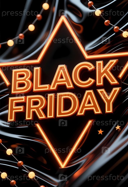 Яркий неоновый знак подчеркивает событие Черной пятницы, окруженное праздничными огнями.Покупатели чувствуют волнение в оживленной атмосфере, идеально подходящей для генеративных предложениях на каникулы
